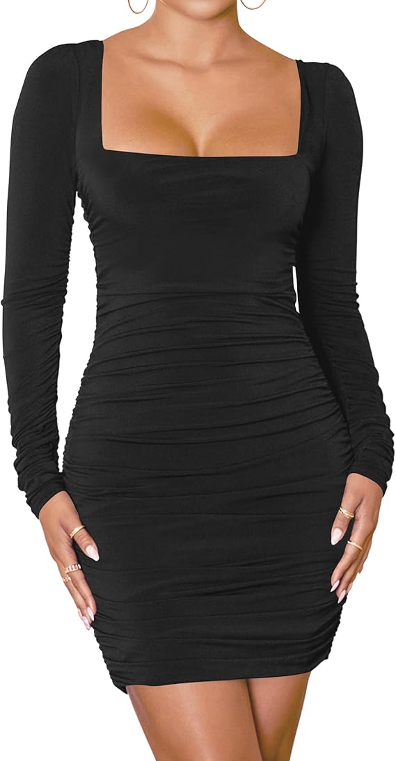 Women's Sexy Ruched Bodycon Square Neck Long Sleeve Tight Party Mini Dress