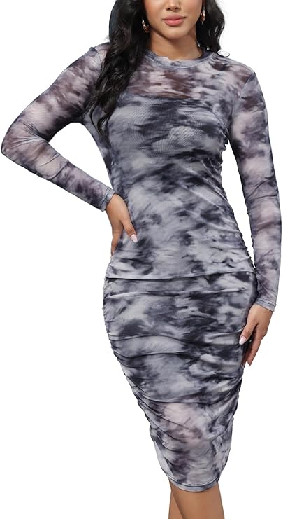 Sexy Long Sleeve Midi Dress for Women Sheer Mesh Printed 2 Piece Skirt Set Crew Neck See Through Bodycon Clubwear